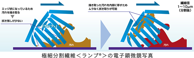 ・クラレ独自の極細分割繊維<ランプ®>を用いた長繊維ニットワイパーで、分割繊維の扁平且つシャープな断面が優れた拭き取り性を発揮します。